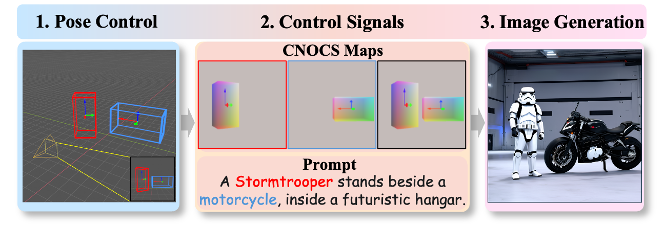 SceneDesigner introduces a user interaction workflow that makes complex 3D scene creation accessible. The process begins with the user operating in a simple 3D interface, where they can place, scale, and rotate cuboids to visually define the precise 9-DoF pose for each desired object. Then, the system will convert the user-defined 3D layout into a novel 2D representation called a CNOCS Map. This map, combined with the text prompt, serves as a comprehensive guide for the generative model, which then produces a high-fidelity image that strictly conforms to the user's spatial and semantic specifications.